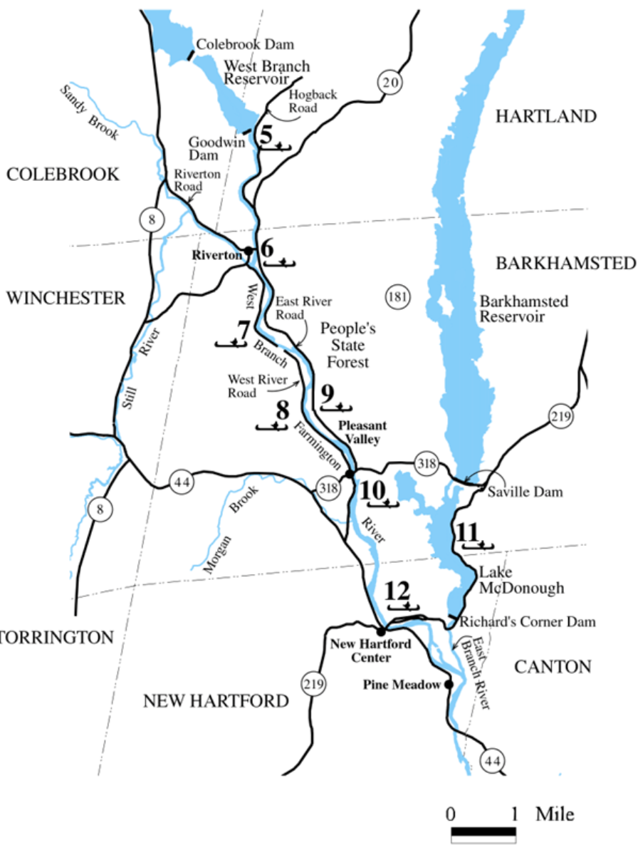 Optimum flow guidelines for paddling are 360 – 980 CFS: Here are links to three USGS gauges that you may find helpful in determining flows – Still River, Riverton, Unionville.